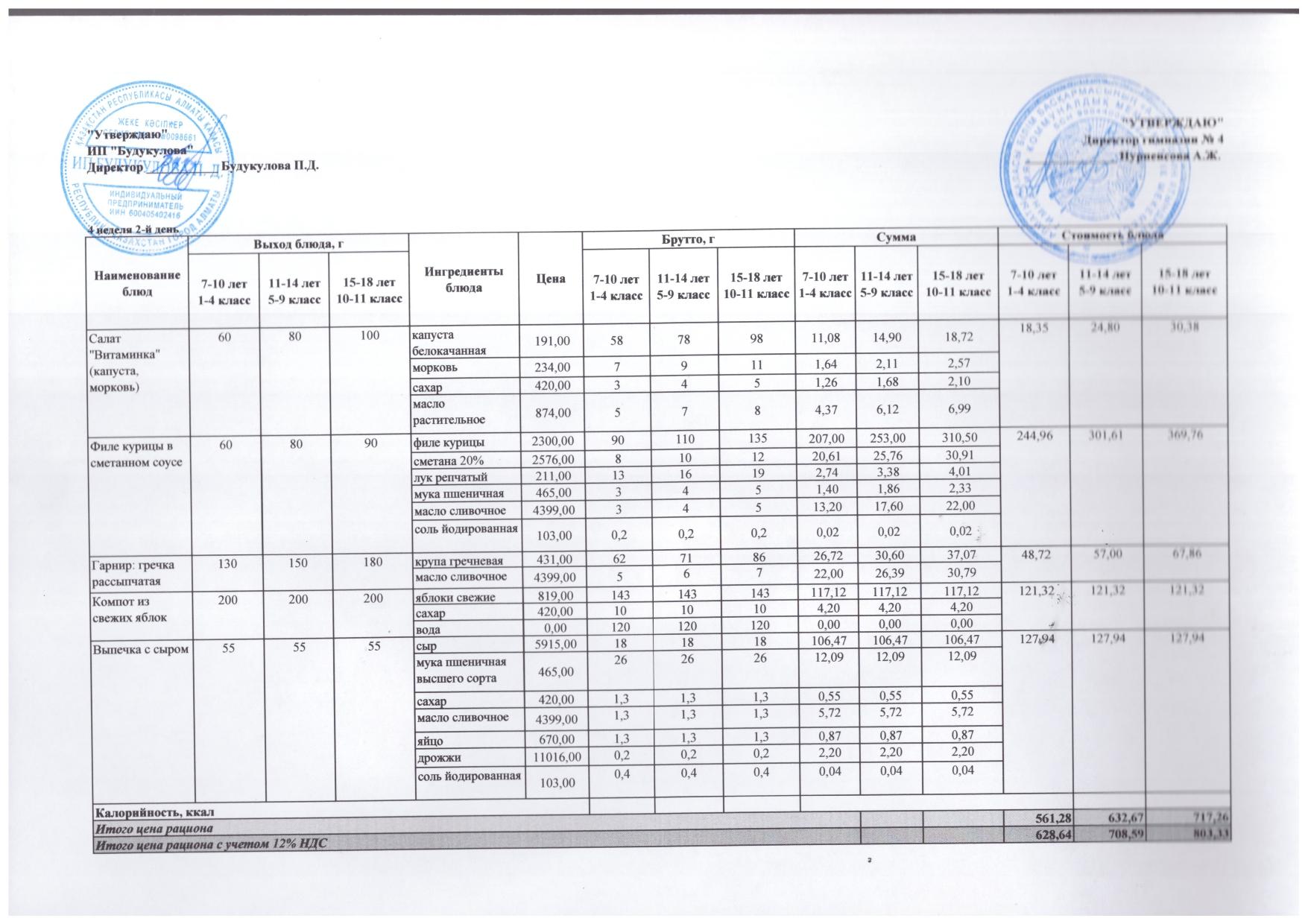 КГУ "Гимназии №4 им. А.С.Пушкина" » Бюджет қаражаты есебінен орта білім беру ұйымдарында білім алушыларды тегін тамақтандыруды ұйымдастыру үшін төрт апталық ас мәзірі