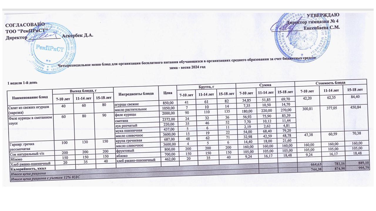 Бюджет қаражаты есебінен орта білім беру ұйымдарында білім алушыларды тегін тамақтандыруды ұйымдастыру үшін төрт апталық ас мәзірі/ Четырехнедельное меню блюд для организации бесплатного питания обучающихся в организациях среднего образования