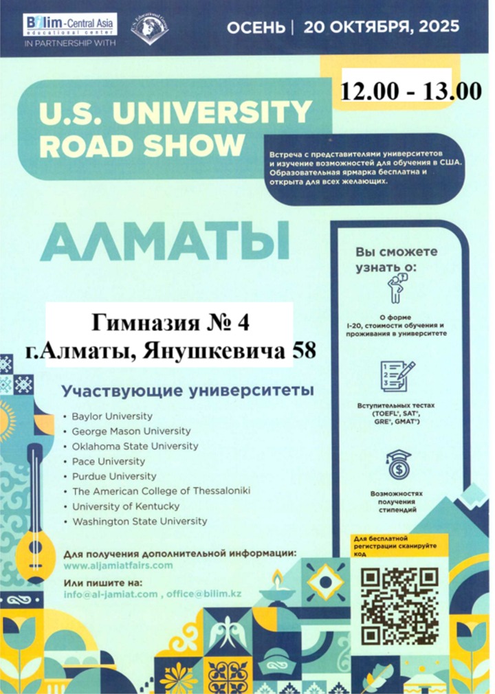 2025 жылдың 20 қазанында гимназияда маңызды кәсіптік бағдар беру іс-шарасы өтті: жоғары курс студенттері мен жетекші халықаралық университеттердің өкілдері, соның ішінде Univercity Kentucky, GEORG MASON university, Baylor University