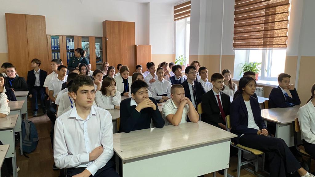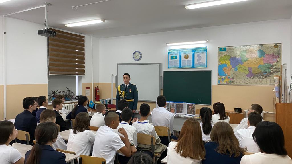 03 октября 2023 г. для учеников 9-11 классов был проведен урок мужество на тему: «Есть такая профессия - Родину защищать» посвященный профессии военного. Цель урока: военно-патриотическое воспитание детей, уважение и любовь к Родине и своему народу. Ведь именно патриотизм воспитает настоящих граждан Республики Казахстан. Ученики гимназии познакомились с историей создания армии, ее боевым прошлым и настоящим. С большим интересом учащиеся смотрели видеоролик, в котором были показаны отрывки из жизни офицеров. Про свою профессию, о любви к нашей Родине, о мужестве и стойкости говорили и гости нашего мероприятия капитан Жаксыбаева Динара Сейтхановна и Лейтенант Пак Даниил Андреевич из воинской части 5571 Национальной гвардии Республики Казахстан.