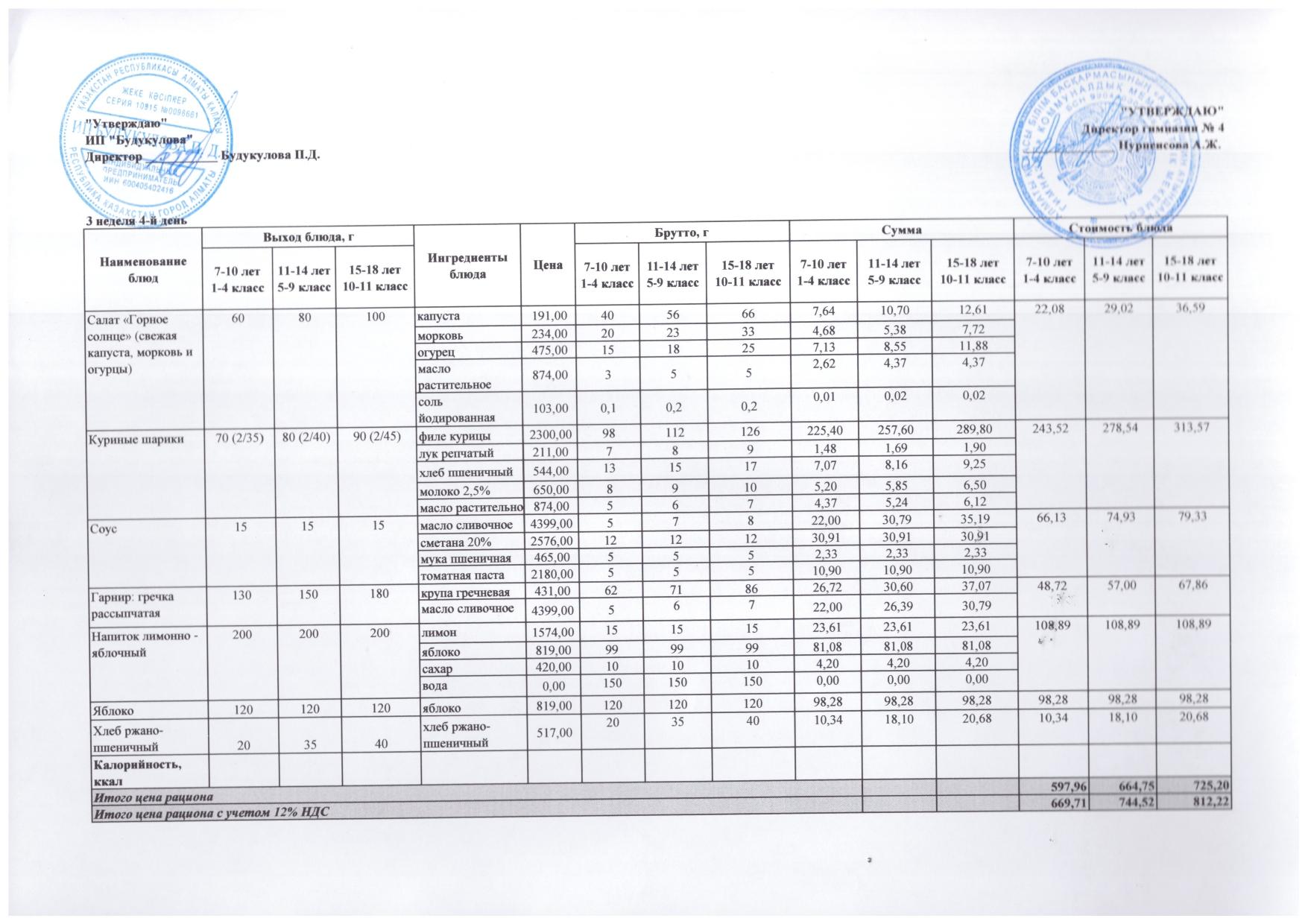 КГУ "Гимназии №4 им. А.С.Пушкина" » Тамақтандыру » Бюджет қаражаты есебінен орта білім беру ұйымдарында білім алушыларды тегін тамақтандыруды ұйымдастыру үшін төрт апталық ас мәзірі