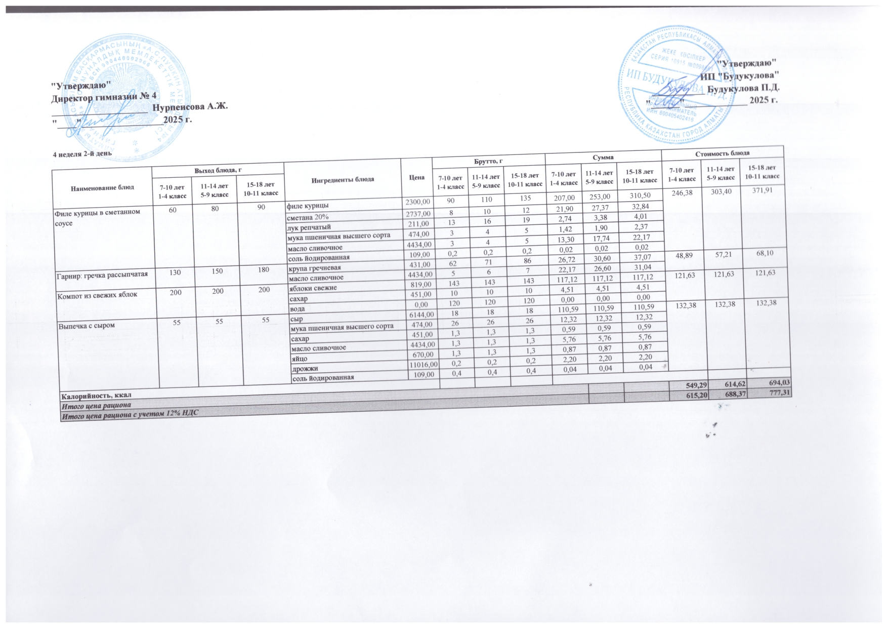 23 желтоқсан 2025 0 1 2 3 4 5 Бюджет қаражаты есебінен орта білім беру ұйымдарында білім алушыларды тегін тамақтандыруды ұйымдастыру үшін төрт апталық ас мәзірі