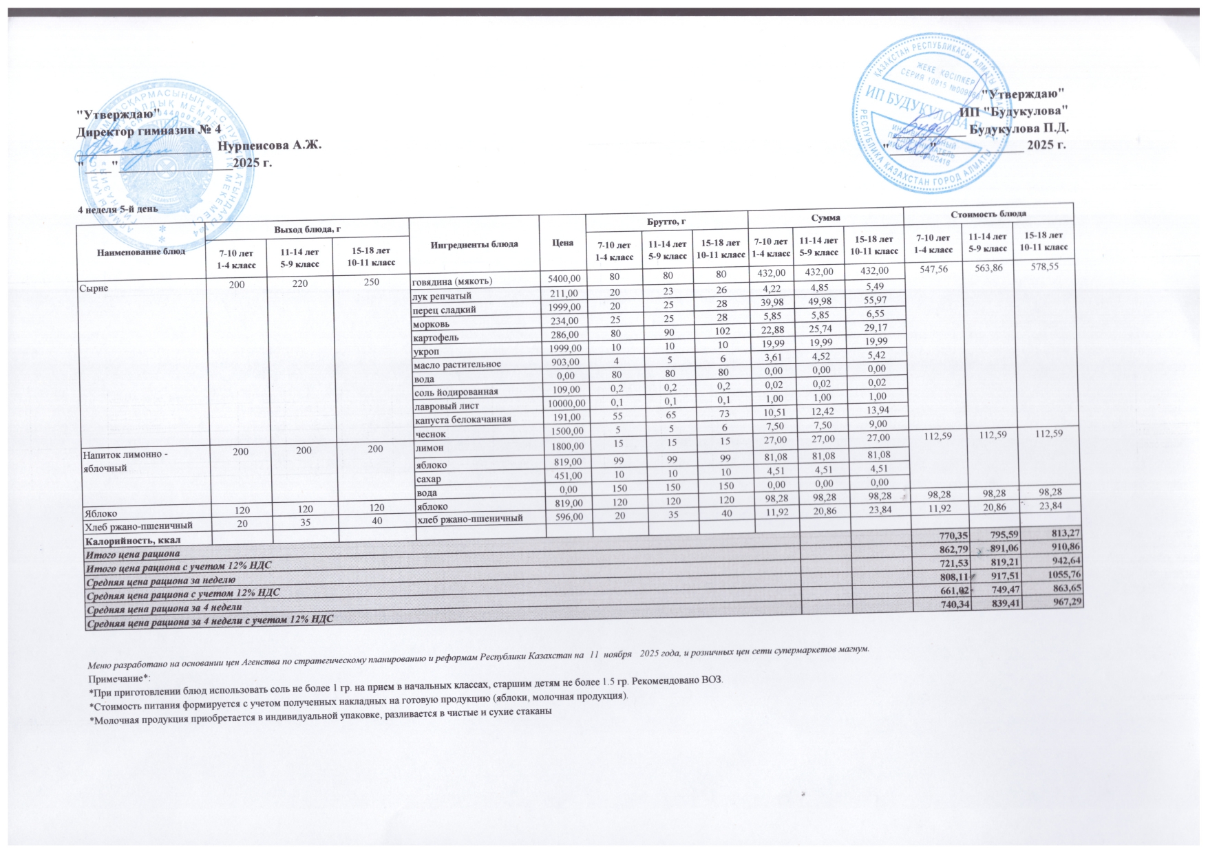 26 желтоқсан 2025 0 1 2 3 4 5 Бюджет қаражаты есебінен орта білім беру ұйымдарында білім алушыларды тегін тамақтандыруды ұйымдастыру үшін төрт апталық ас мәзірі