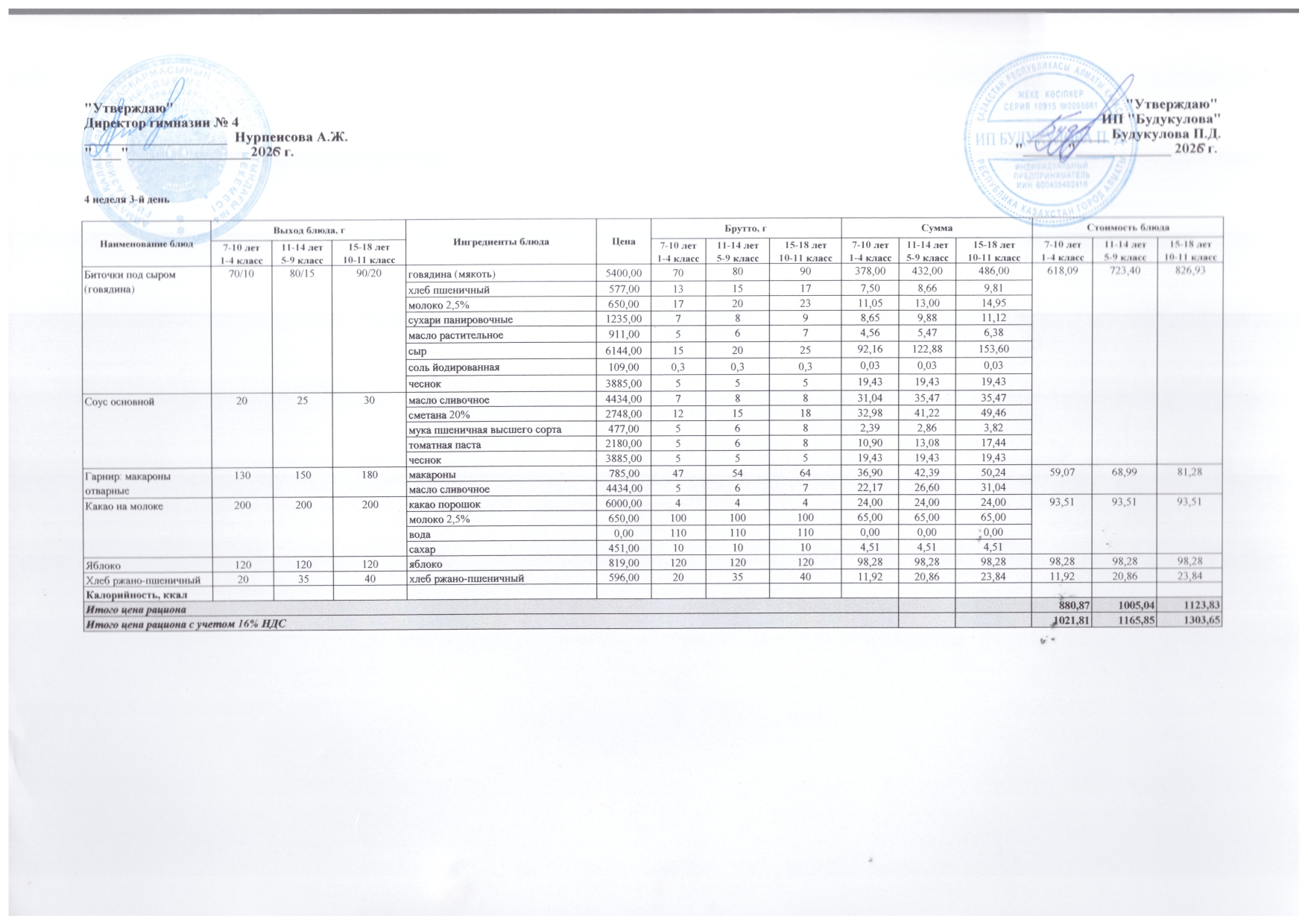 КГУ "Гимназии №4 им. А.С.Пушкина" » Тамақтандыру » Бюджет қаражаты есебінен орта білім беру ұйымдарында білім алушыларды тегін тамақтандыруды ұйымдастыру үшін төрт апталық ас мәзірі