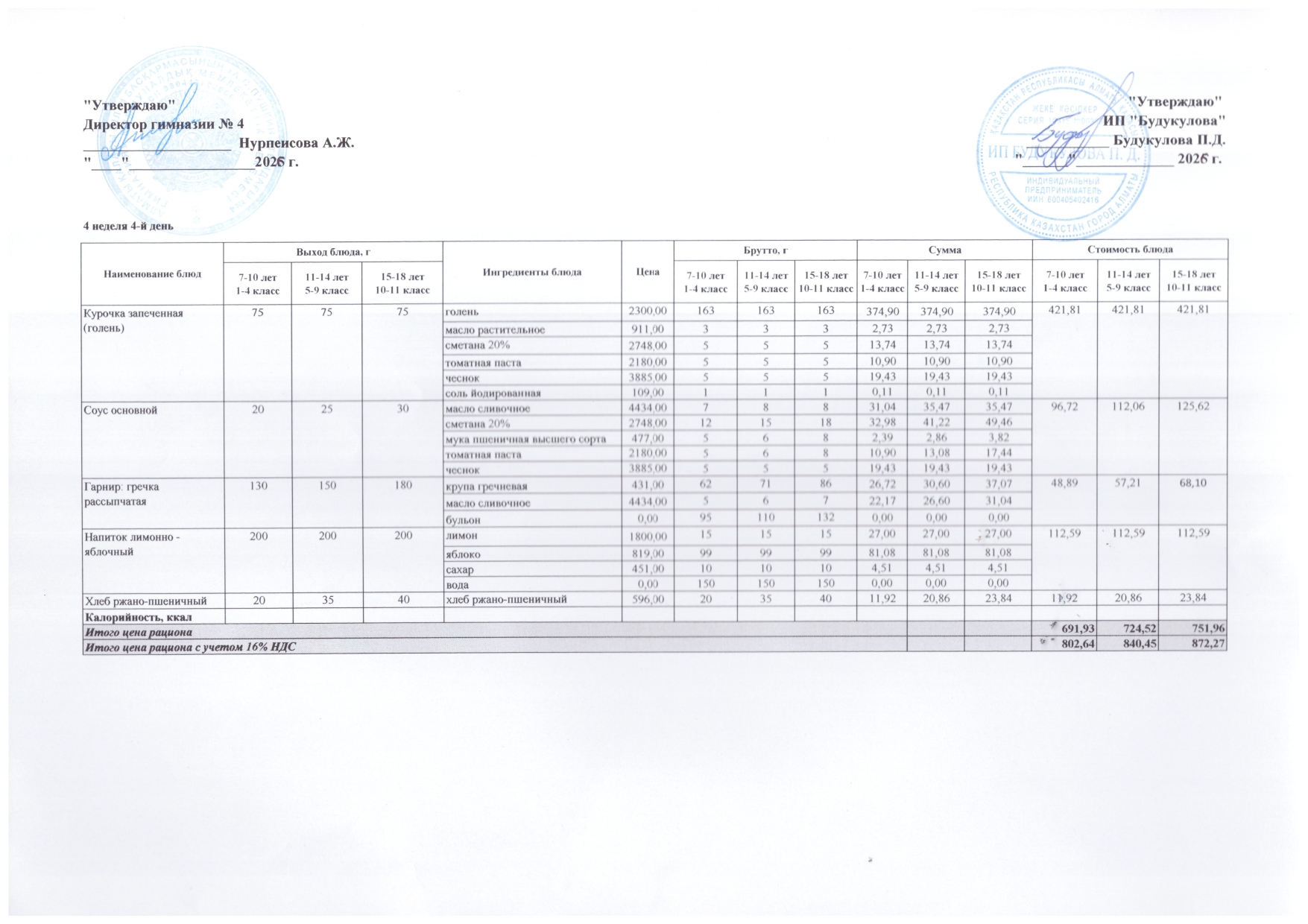 29 қаңтар 2026 0 1 2 3 4 5 Бюджет қаражаты есебінен орта білім беру ұйымдарында білім алушыларды тегін тамақтандыруды ұйымдастыру үшін төрт апталық ас мәзірі
