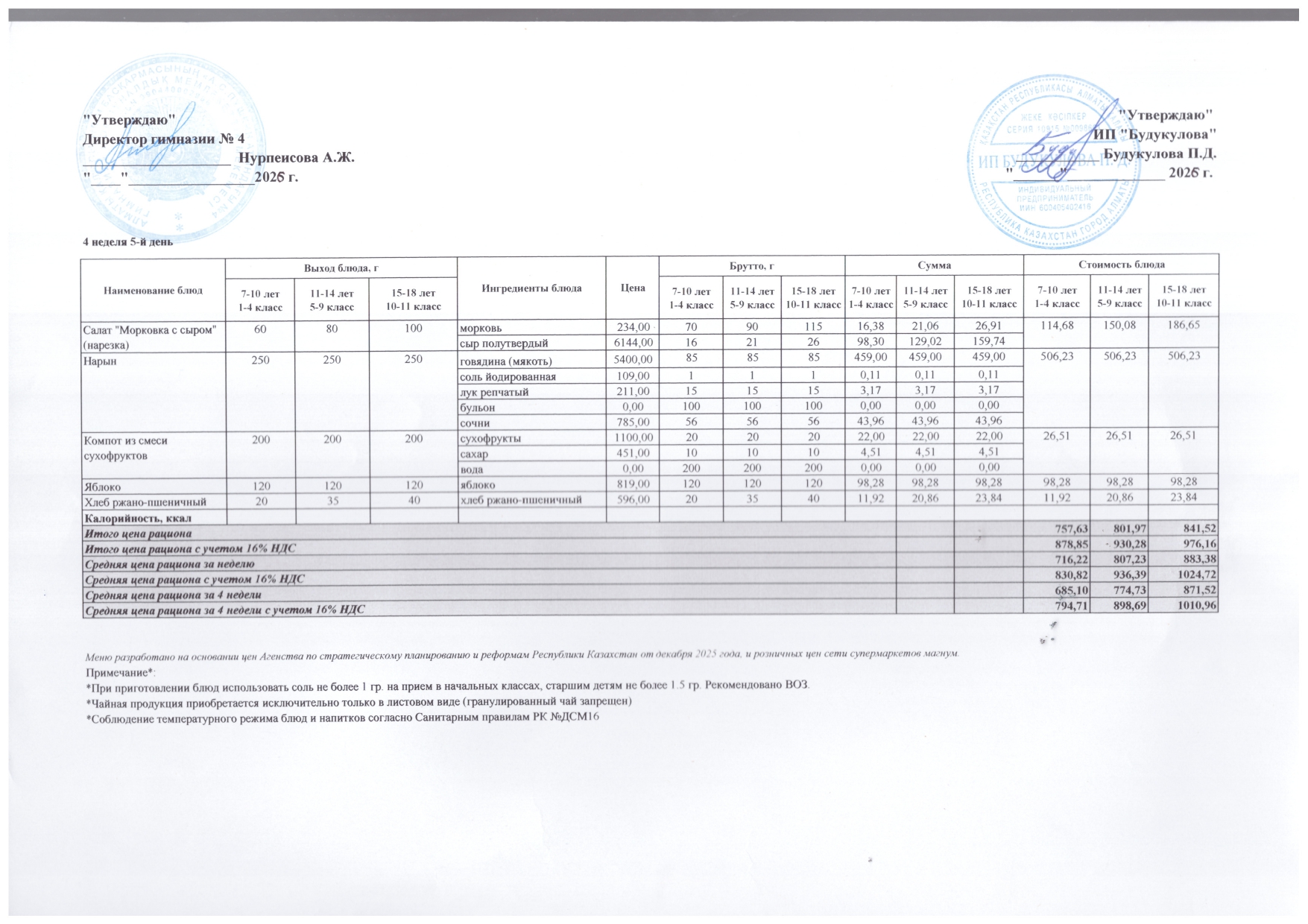 КГУ "Гимназии №4 им. А.С.Пушкина" » Тамақтандыру » Бюджет қаражаты есебінен орта білім беру ұйымдарында білім алушыларды тегін тамақтандыруды ұйымдастыру үшін төрт апталық ас мәзірі